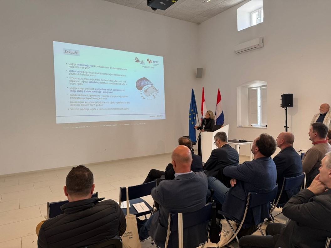 Dr.sc. Melita Peharda je sudjelovala na Adriatic Mariculture 2026 koji se održao u Malom Stonu 20. ožujka 2026. godine. Ovaj znanstveno-stručni skup okupio je znanstvenike koji rade na različitim aspektima marikulture u području Jadranskog mora, kao i proizvođače i predstavnike različitih institucija. Dr.sc. Peharda Uljević predstavila je rezultate prikupljene u okviru projekta BivalveSPEECH o rastu dagnji u uvjetima klimatskih promjena, uključujući učinke visokih ljetnih temperatura i produljenih uvjeta niskog saliniteta tijekom hladnijeg dijela godine.